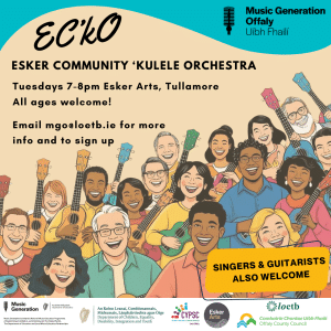 Esker Community ‘kulele Orchestra is a community music group based in Esker Arts in Tullamore and is open to all, young and old, and we are always looking for new members who would like to come along and join in the fun of making music together. All instruments and singers are welcome.