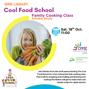 Join us in Birr Library for a family cooking class with Cool Food School. One of the best ways to encourage a child to eat well is to get them involved in cooking. All children will get to make their own apple donuts.