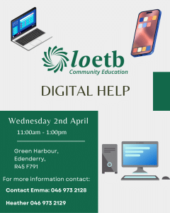 LOETB are hosting Digital Help classes at Green Harbour Edenderry starting Wednesday 2nd April from 11:00 to 1:00pm