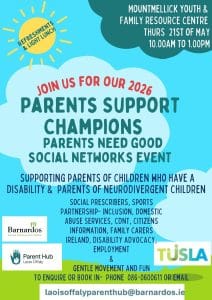 Come join us on the 21st May 2026 from 10am to 1pm in Mountmellick FRC for a social network event for Parents of children with additional needs.